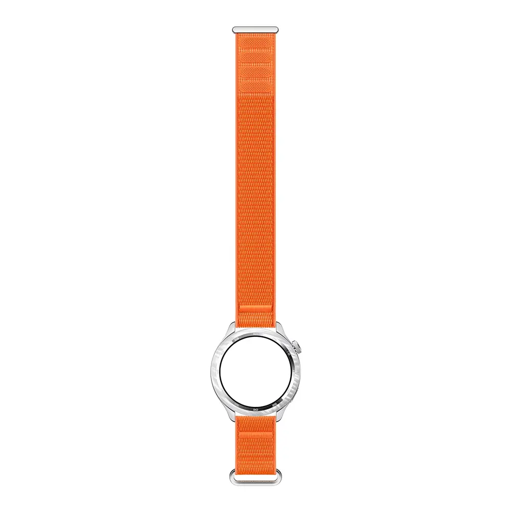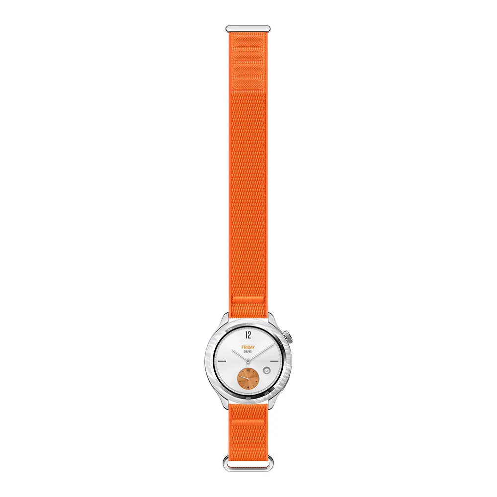 Die Lünette aus Edelstahl in festlichem Orange setzt einen markanten Akzent und verleiht der Smartwatch ein sportlich-elegantes Design. Das passende Nylonarmband sorgt für hohen Tragekomfort, ist besonders leicht und atmungsaktiv – ideal für den täglichen Gebrauch und Outdoor-Aktivitäten.
