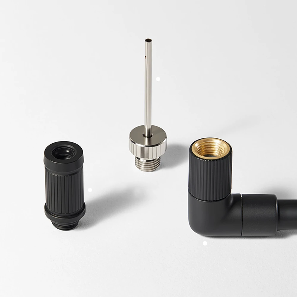 Ein integriertes Mikrodiplay ermöglicht die direkte Kontrolle der eingestellten und gemessenen Werte. Für den Einsatz bei schlechten Lichtverhältnissen ist zusätzlich eine eingebaute Beleuchtung vorhanden, die sowohl dauerhaftes weisses Licht als auch einen SOS-Warnmodus unterstützt. Die mitgelieferten Ventiladapter erweitern die Kompatibilität mit Schrader- und Presta-Ventilen sowie mit Nadelventilen für verschiedene Ballarten. Ein L-förmiger Luftschlauch erleichtert die Handhabung beim Aufpumpen, während der mitgelieferte Aufbewahrungsbeutel Zubehör und Gerät ordentlich zusammenhält.