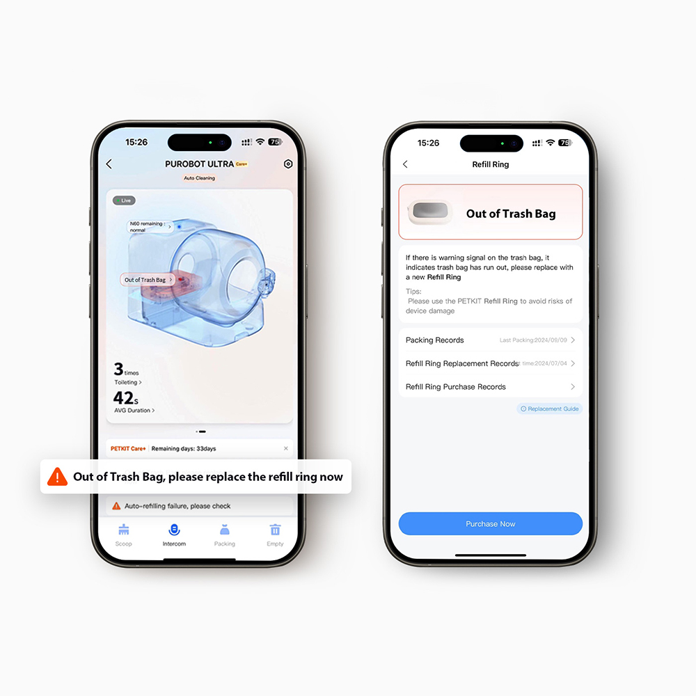Dank sichtbarer Warnmarkierungen auf den Müllbeuteln und der intelligenten NFC-Erkennung über die PETKIT-App erhalten Nutzer rechtzeitig Hinweise, wenn der Nachfüllring ausgetauscht werden muss.