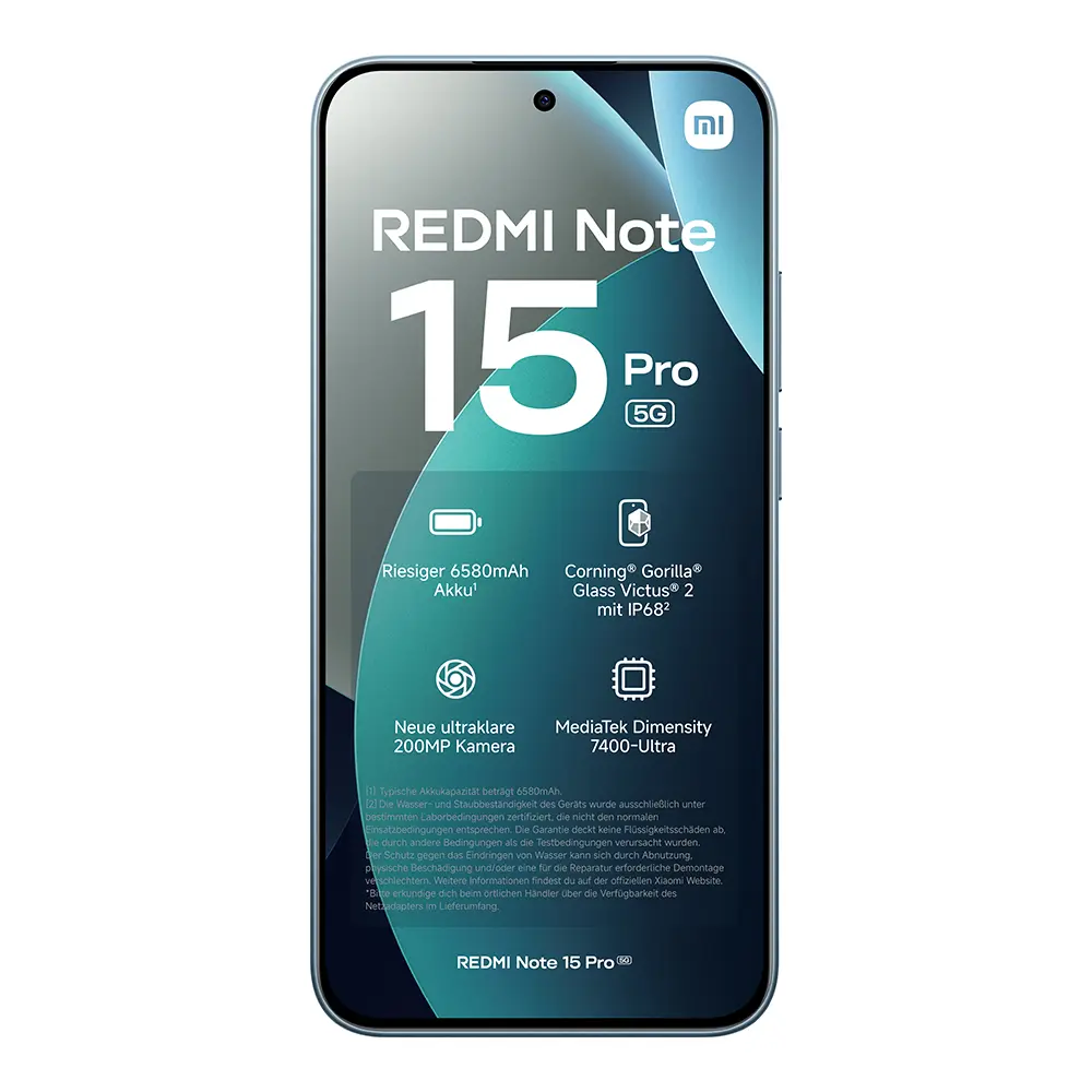 | Lieferumfang: | 1x Redmi Note 15 Pro 5G, 1x USB-C-Kabel, 1x SIM-Auswurftool, 1x Schutzhülle, 1x Kurzanleitung |