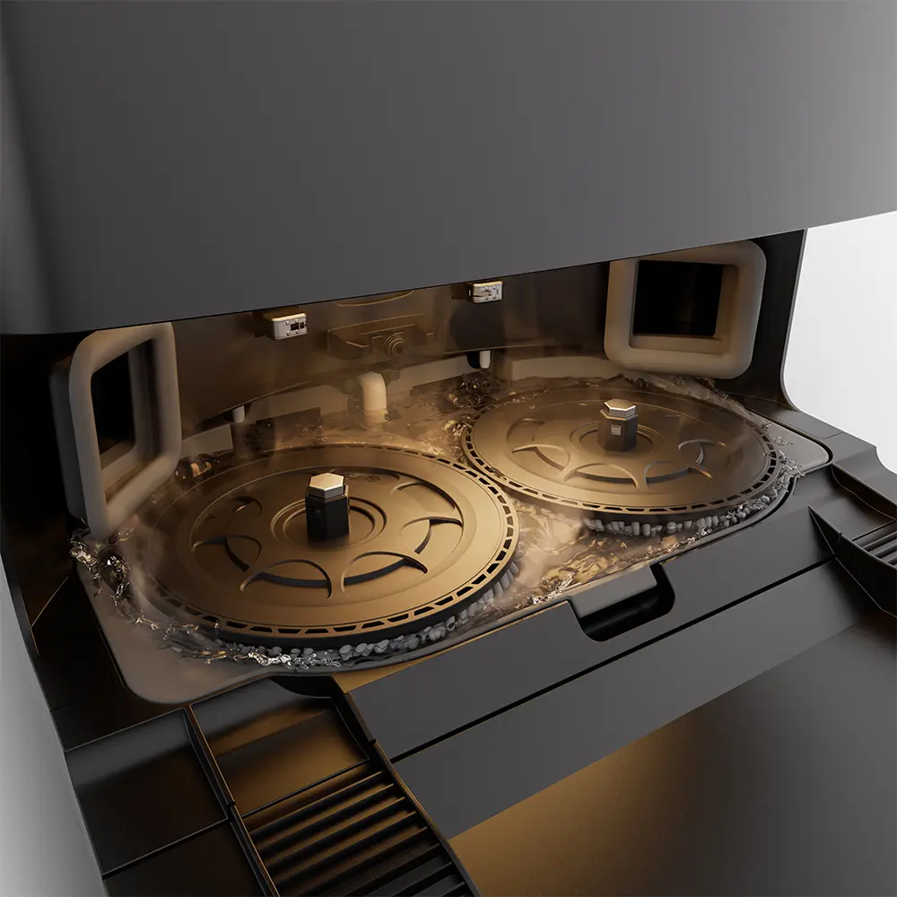 Das Gerät setzt eine beeindruckende HyperForce Saugleistung von 12000 Pa ein, um tiefsitzenden Schmutz sowohl auf Hartböden als auch auf Teppichen wirkungsvoll zu lösen. Die DuoDivide Hauptbürste kombiniert zwei kurze Borstenwalzen mit spiralförmigen Klingen, die Haare zielgerichtet in den Staubeinlass leiten, ohne Verwicklungen zu verursachen. Ergänzt wird diese Reinigung durch eine seitliche Anti-Tangle-Bürste mit asymmetrischer, bogenförmiger Konstruktion, welche Haare effizient zu den Borstenenden führt.