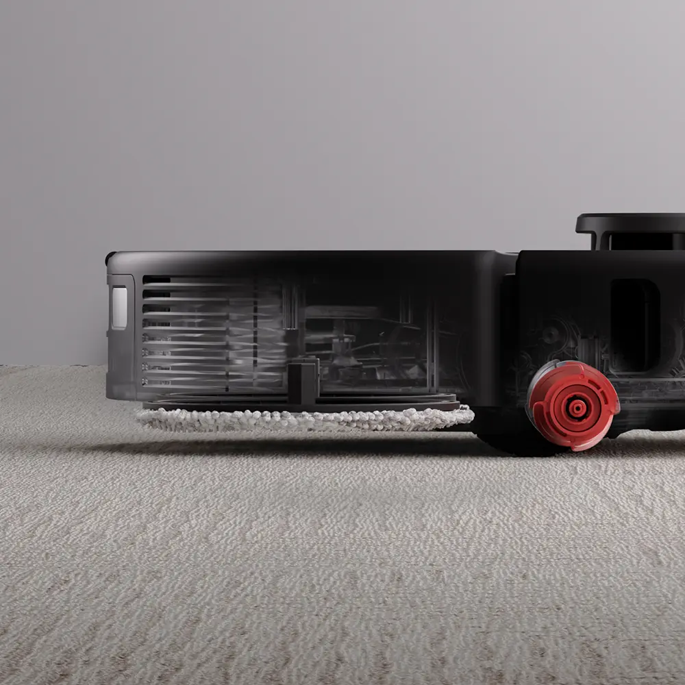 Das FlexiArm-Design passt sich automatisch an Raumstrukturen wie Ecken und Möbelkanten an und erreicht fast vollständige Kantenabdeckung. Zwei rotierende Mop-Pads arbeiten mit bis zu 200 Umdrehungen pro Minute und einer Hubbewegung von bis zu 10 mm. Der Wasserfluss lässt sich in 30 Stufen variieren, wodurch sich die Feuchtigkeitsabgabe präzise auf den Bodenbelag abstimmen lässt.