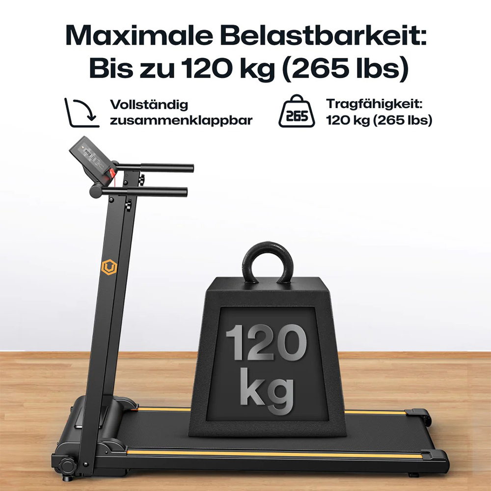 Dank des einfachen Faltmechanismus lässt sich das Laufband in nur einem Schritt auf eine kompakte Grösse von 122 x 66 x 14 cm zusammenklappen. Es wiegt lediglich 22.5 kg und passt mühelos unter Betten oder Sofas, sodass es minimalen Platz beansprucht und sich ideal für kleine Wohnräume eignet.