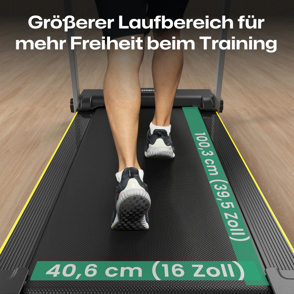 Die 40 cm breite, rutschfeste Lauffläche bietet ein sicheres und komfortables Lauferlebnis für alle – einschliesslich der Haustiere. Das Laufband ist perfekt geeignet, um sowohl Familienmitglieder als auch Hunde fit zu halten.