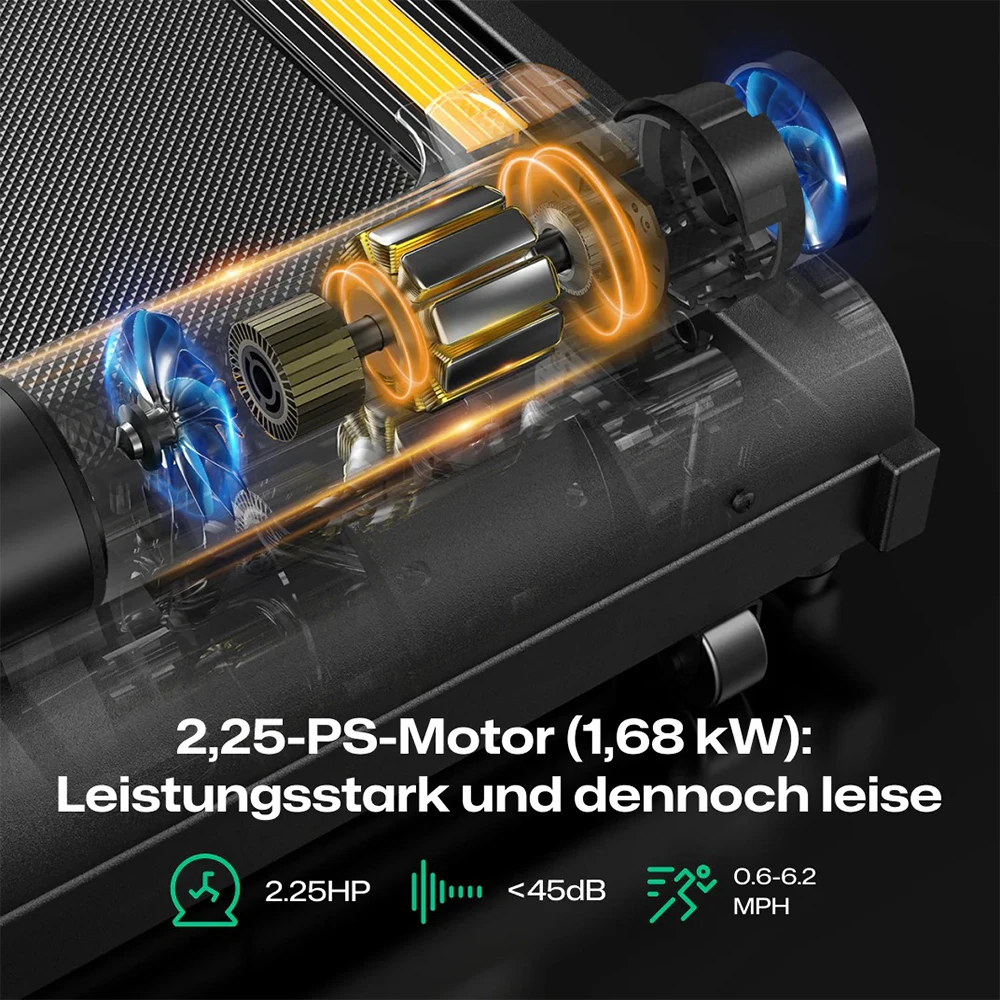 Der 2.25 PS Motor bietet Geschwindigkeiten von 1 bis 10 km/h und gewährleistet einen stabilen Betrieb bei einer Belastbarkeit von bis zu 120 kg. Der leise Motor sorgt dafür, dass das Training andere Personen nicht stört. Die fünfschichtige, rutschfeste Lauffläche ist langlebig, geräuscharm und durch die innovative Press-Technologie besonders glatt.