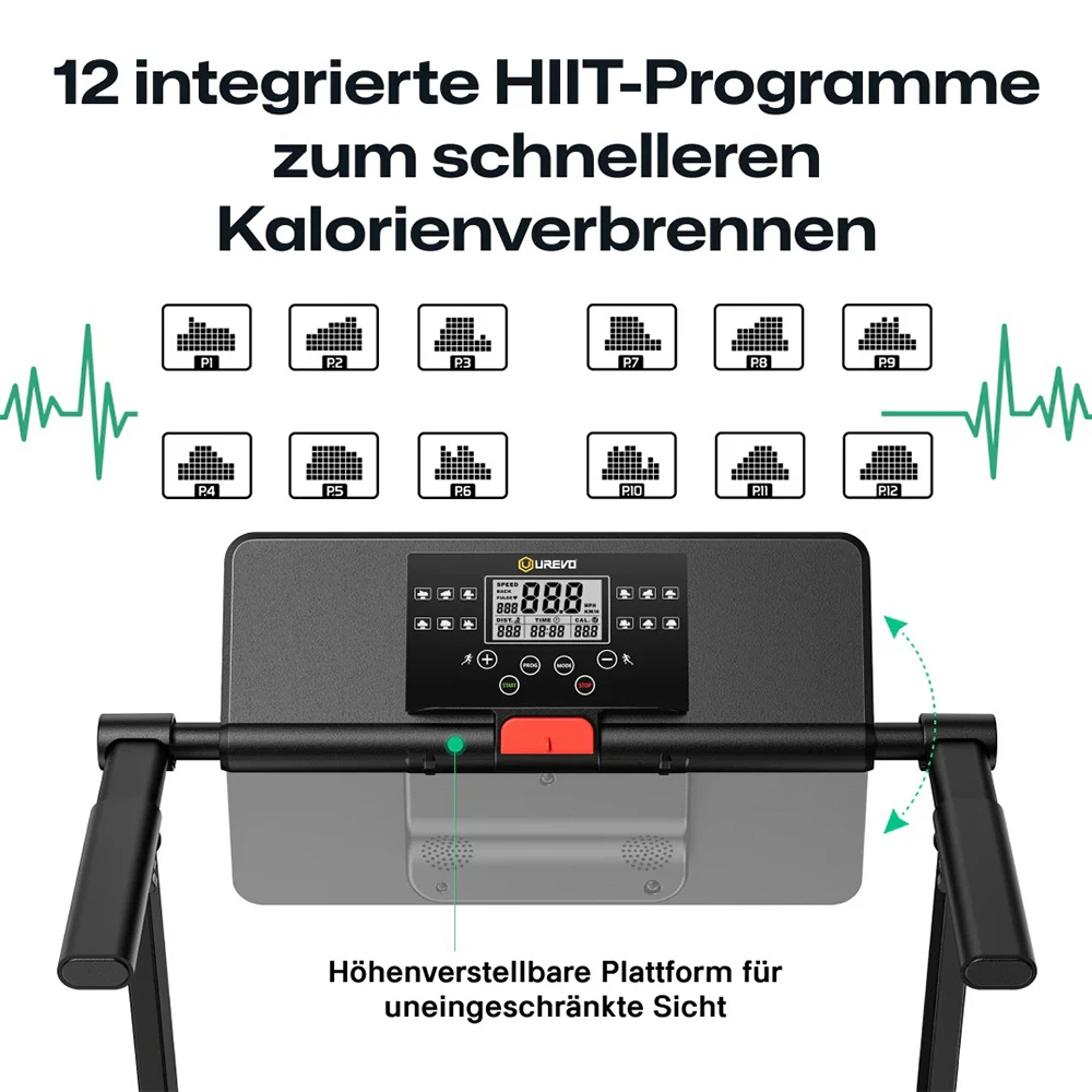 | Zusätzliche Funktionen: | 12 HIIT-Programme, Telefonhalter, kompakte Lagerung unter Möbeln |