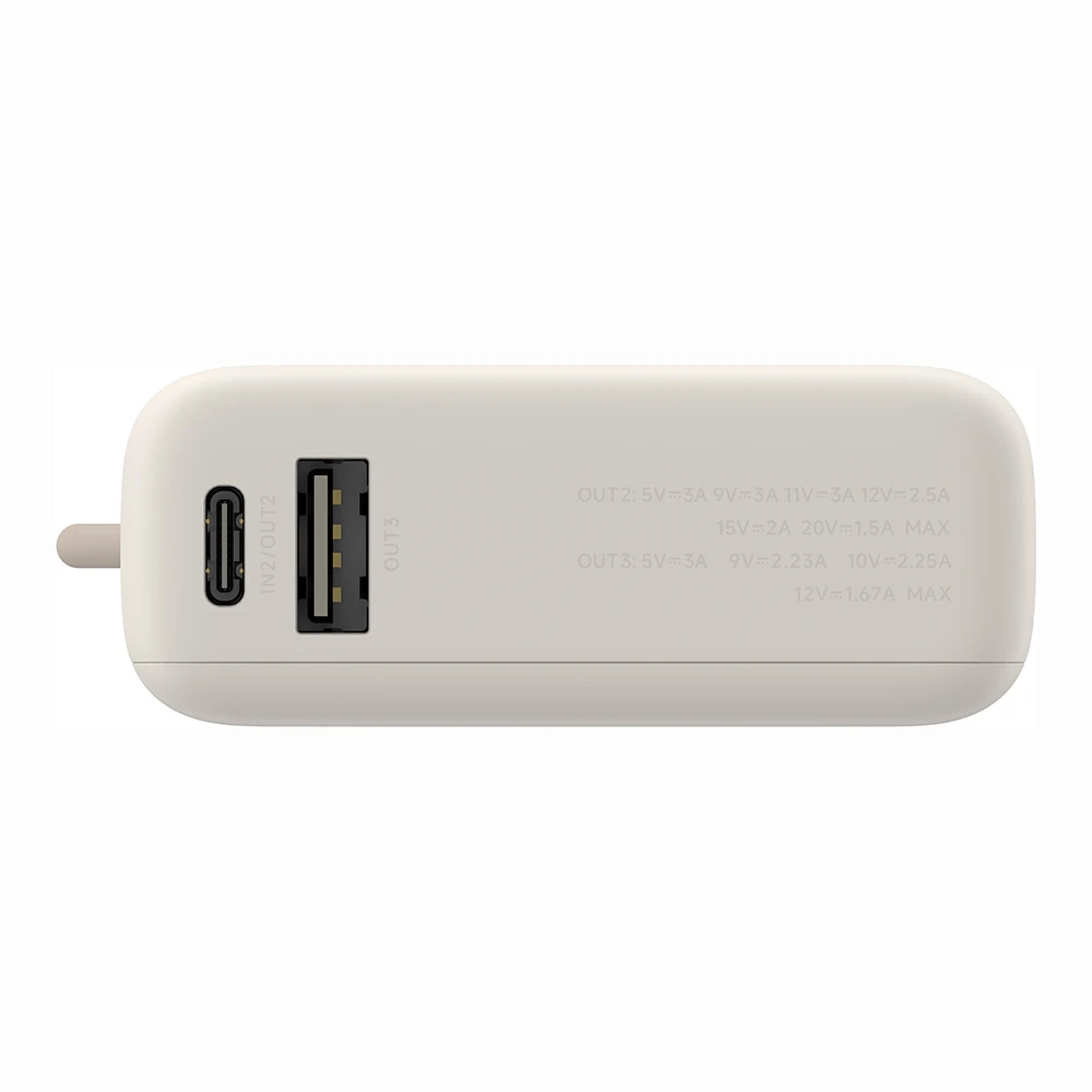Die Power Bank bietet drei Ausgänge: ein USB-C-Anschluss, ein integriertes USB-C-Kabel und ein USB-A-Anschluss. Diese ermöglichen das gleichzeitige Laden von bis zu drei Geräten, ohne Kompromisse bei der Leistung einzugehen. Das integrierte Kabel sorgt für zusätzlichen Komfort und macht zusätzliche Kabel überflüssig.