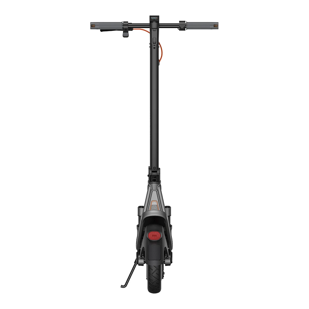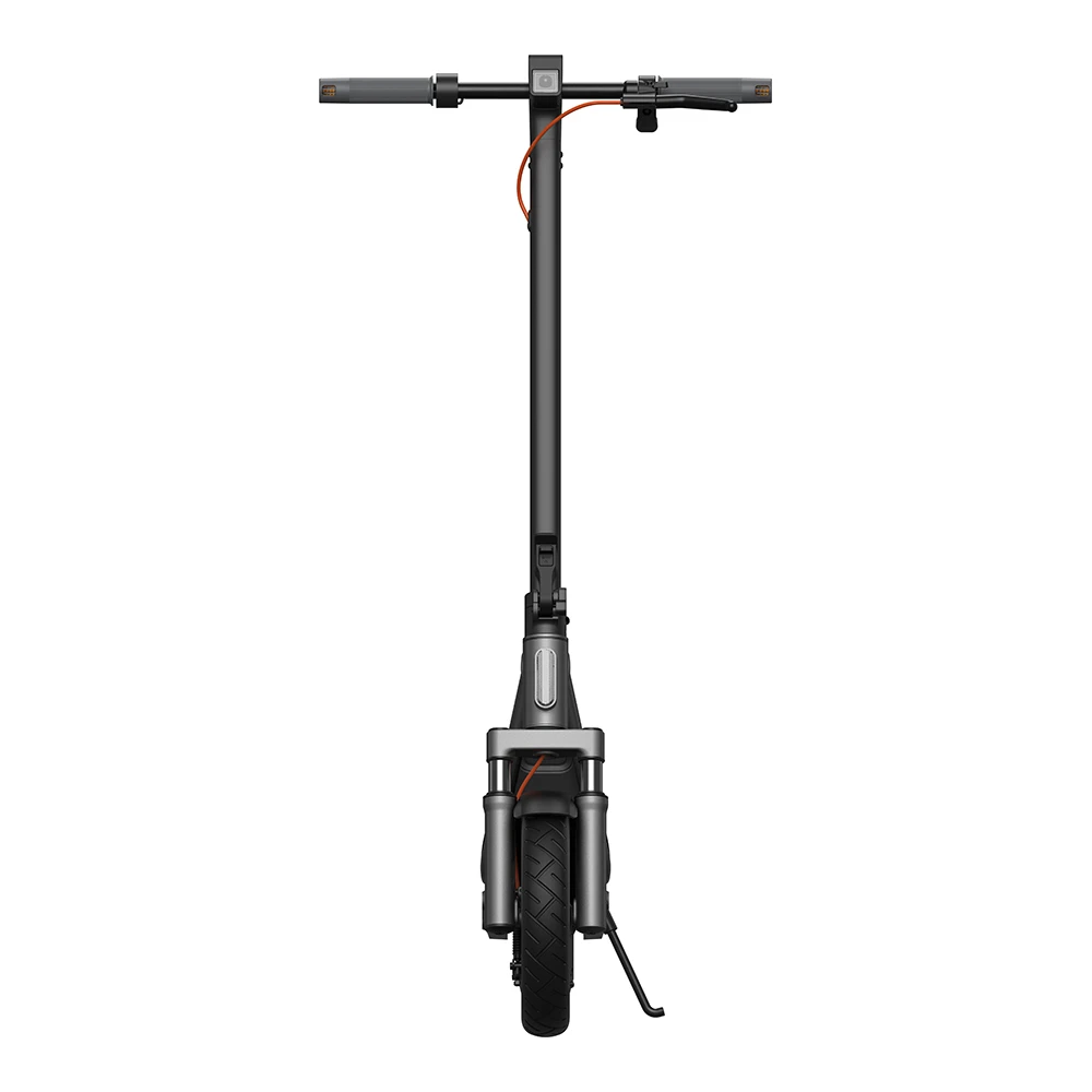 Für ein hohes Mass an Sicherheit sorgt das duale Bremssystem mit einer Trommelbremse an der Vorderachse und einer elektronischen E-ABS-Bremse am Hinterrad. Diese Kombination ermöglicht kontrollierte Bremsmanöver auch bei höherem Tempo und verbessert die Fahrstabilität bei plötzlichen Verzögerungen. Ergänzt wird das Sicherheitskonzept durch die IPX5-Zertifizierung, welche den gesamten Scooter gegen Spritzwasser schützt.