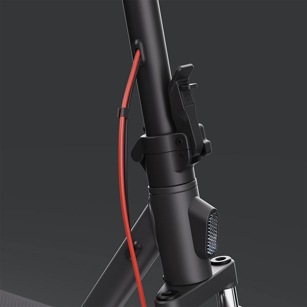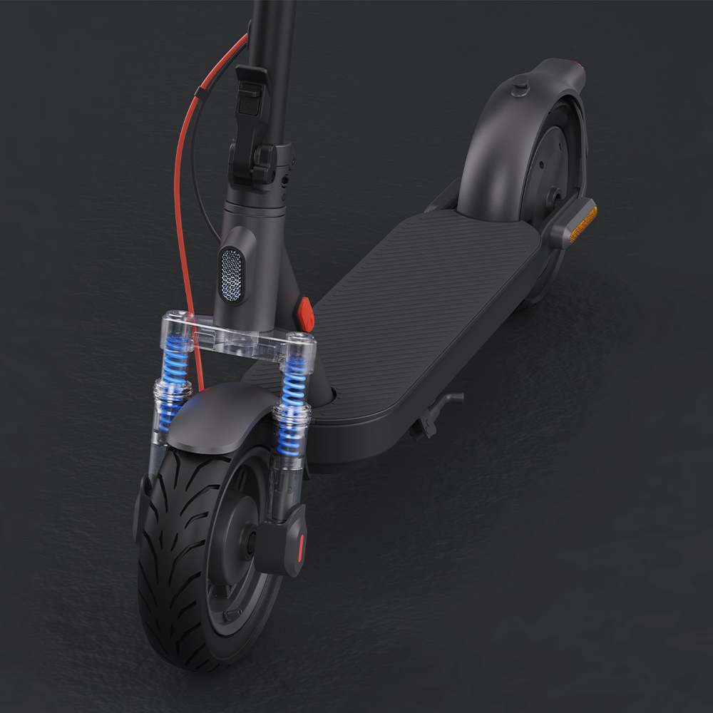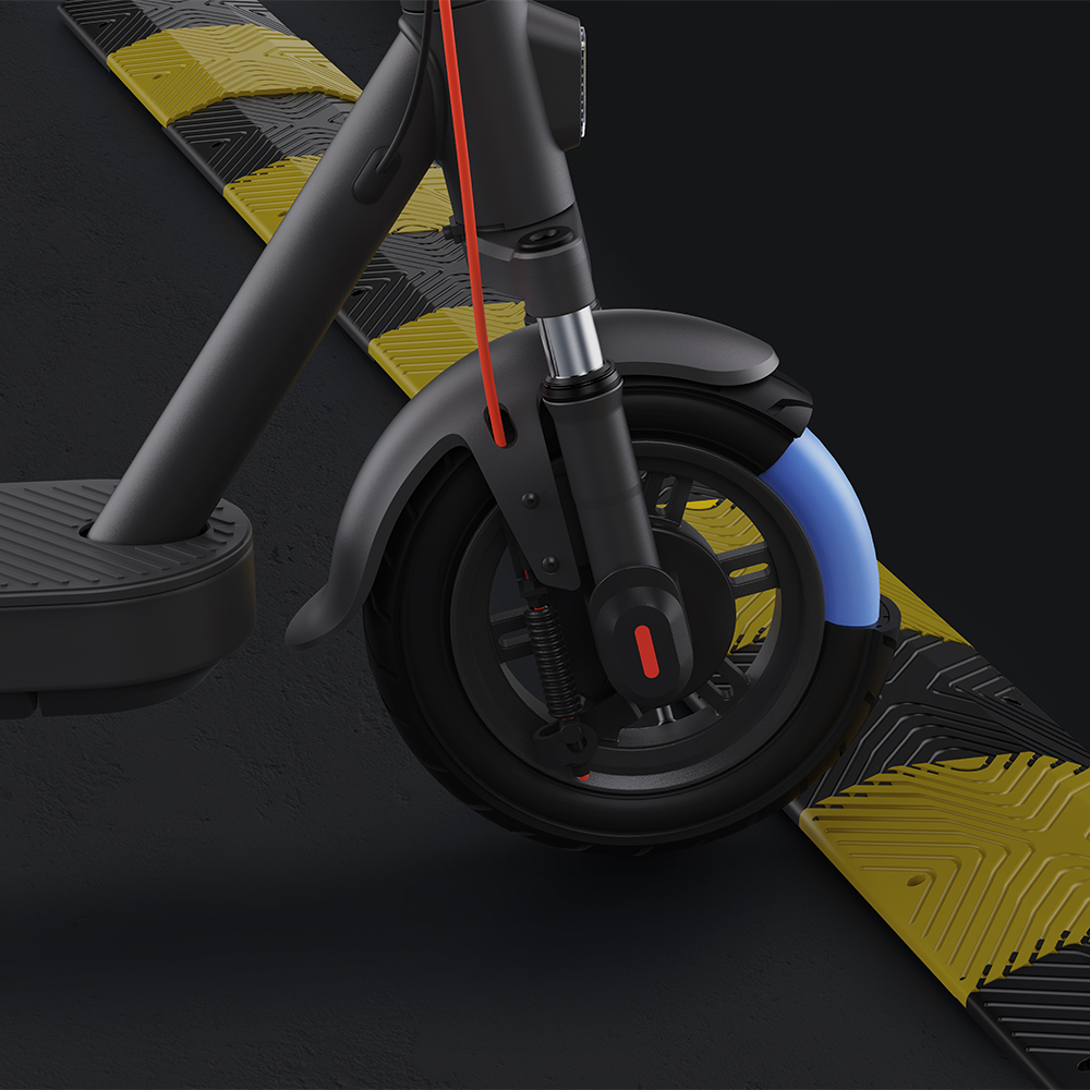Der Scooter verfügt über ein hochleistungsfähiges vorderes Doppelfederungssystem mit einer Stossdämpfung von 30 mm, das Unebenheiten auf der Strasse effektiv abfängt und eine besonders sanfte Fahrt ermöglicht.