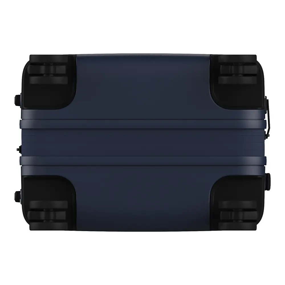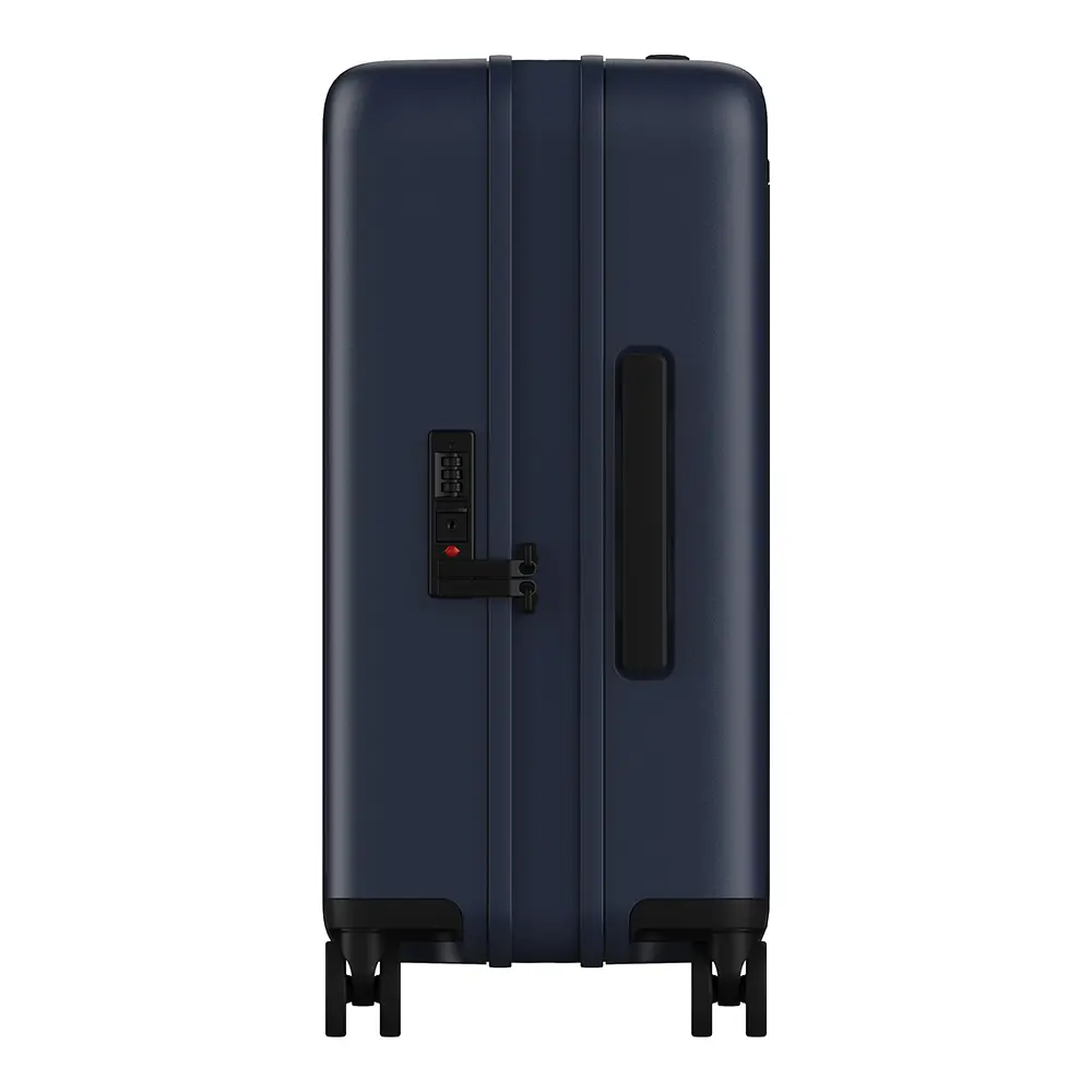 Die Hülle des Rollkoffers ist aus Composite-PC gefertigt und basiert auf druck- sowie stossfestem Covestro-PC. Dieses Material gewährleistet eine hohe Widerstandsfähigkeit gegen raues Handling und unterstützt den Schutz vor Stössen. Die 55 mm grossen omnidirektionalen Räder mit metallischem Achslager ermöglichen ein müheloses und leises Manövrieren, während der gezielt eingelassene Griff und die abgesenkte Basis den Koffer zusätzlich stabilisieren und den Stauraum erweitern.