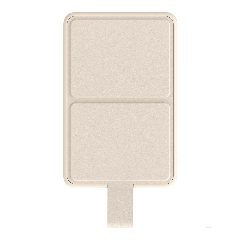 Die Rückseite der Power Bank besteht aus technologischem Nano-Leder, das sich nicht nur weich und glatt anfühlt, sondern auch schmutz- und verschleissfest ist. Das kompakte Design passt bequem in eine Hand und schmiegt sich eng an die Rückseite des Smartphones an, um einen angenehmen Halt zu gewährleisten.