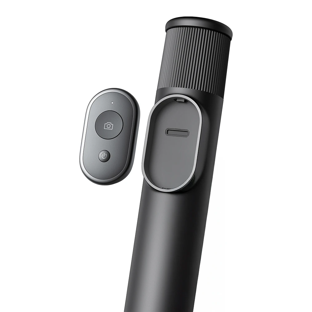 In den Griff des Selfie-Sticks ist eine drahtlose Bluetooth-Fernbedienung integriert. Diese ermöglicht die Steuerung des Auslösers aus der Distanz und unterstützt sowohl Serienaufnahmen als auch kurze Videoaufnahmen – abhängig von den Funktionen des Smartphones. Die kompakte Fernbedienung ist einfach im Griff verstaubar und stets zugänglich, ohne separat transportiert werden zu müssen.