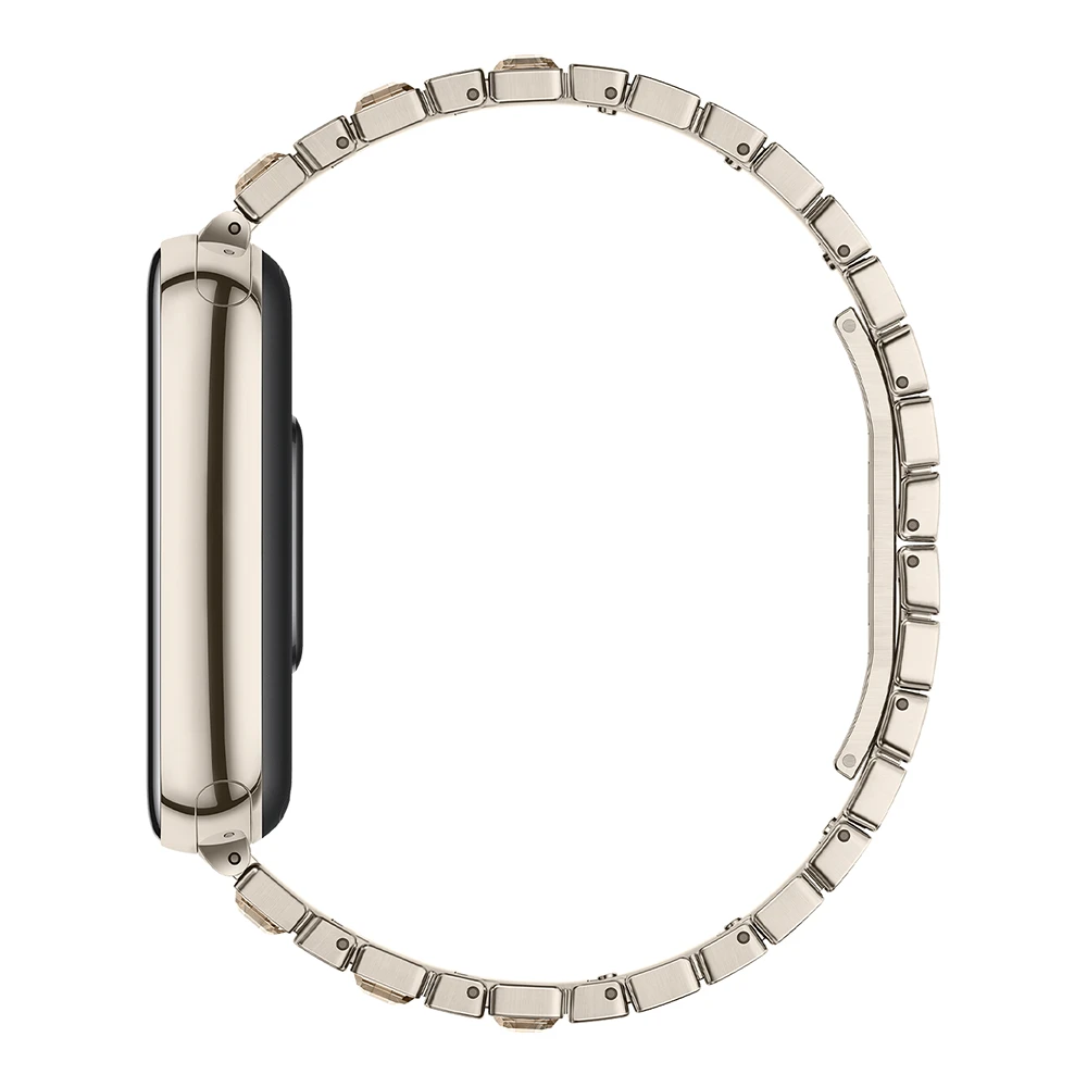 Die Glimmer Edition zeichnet sich durch einen Aluminiumlegierungsrahmen mit hochglanzpolierter PVD-Beschichtung sowie ein Edelstahlarmband mit eingelassenen Glaskristallen aus. Mit Abmessungen von etwa 46.57 x 22.54 x 10,95 mm und einem Gewicht von rund 16.25 g (ohne Armband) bietet das Gerät eine äusserst schlanke und leichte Bauweise. Der Armbandumfang dieser Edition ist auf etwa 135-180 mm ausgelegt, wodurch ein komfortabler Sitz gewährleistet ist.